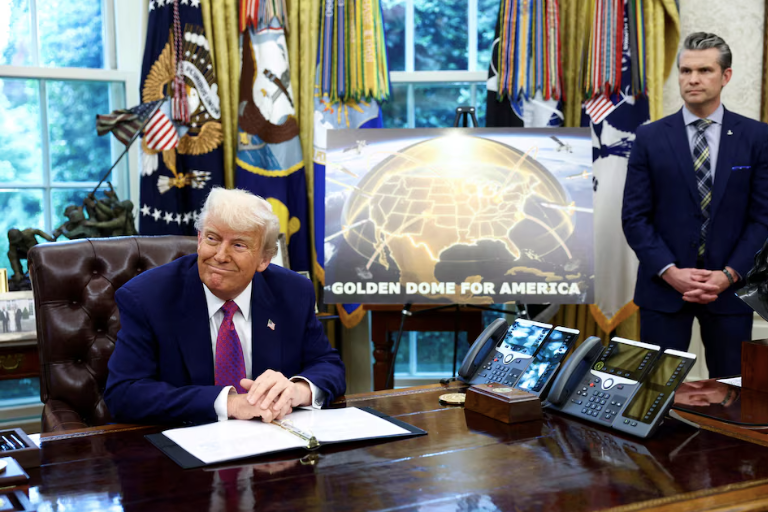 Tổng thống Mỹ Donald Trump ra thông báo liên quan dự án phòng thủ tên lửa Golden Dome bên cạnh Bộ trưởng Quốc phòng Hoa Kỳ Pete Hegseth. (Ảnh: Reuters)