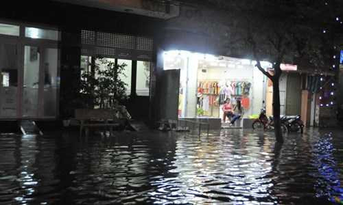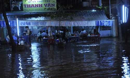 | Tuyến đường Trần Văn Hoài dài hơn 1 km cũng ngập hoàn toàn, nước tràn vào quán xá hai bên đường. Các tuyến đường chính khác như 30/4, 3/2, Trần Hưng Đạo, Võ Thị Sáu, Cao Thắng, Nguyễn Ngọc Trai... nhiều đoạn cũng chìm trong nước. |