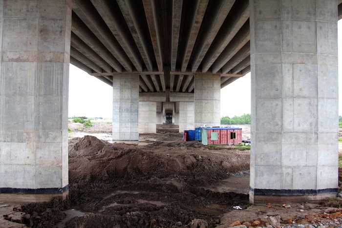 Những chiếc ống bơm cát được tập kết dưới trụ cầu, gầm cầu được san lấp làm đường vận chuyển cát.