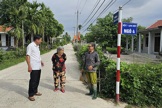 Người dân thôn Lam Thủy (xã Hải Hưng, huyện Hải Lăng, tỉnh Quảng Trị) vui mừng khi con đường liên thôn được đặt tên, nhà được gắn số. (Ảnh: Báo Quảng Trị)