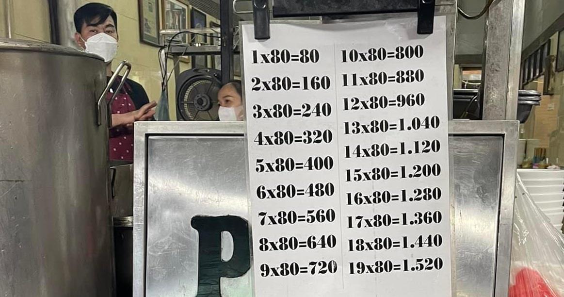 Đáng nói là tấm ảnh báo giá được ông chủ "cộng trừ nhân chia" rất cẩn thận, để khách có thể dễ dàng hơn trong việc tính toán và trả tiền ăn. "Bảng cửu chương 80" từ 1 cho tới 19 bát phở được liệt kê chi tiết, khách hàng cứ theo đó mà trả tiền.