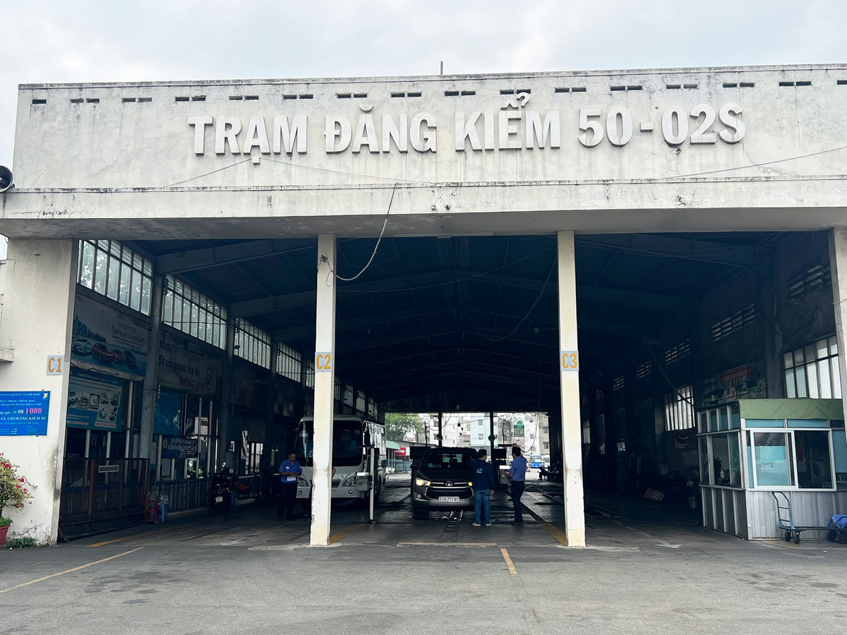 Tại Trung tâm Đăng kiểm 50-03S, các phương tiện đến chờ đăng kiểm tập trung ở khu vực sân trước, không có cảnh phải xếp hàng dài ra đến ngoài đường.