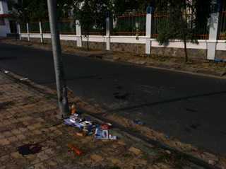Tại hiện trường mảnh vụn vỡ của xe máy vương vãi khắp mặt đường, chiếc xe máy bị biến dạng hoàn toàn, tại điểm đối đầu xe máy và trụ đèn, thân trụ đèn bị móp méo, biến dạng.