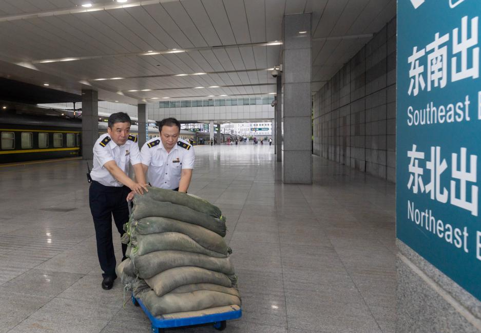Nhân viên Ga Thượng Hải vận chuyển các bao cát chống lũ trước khi bão Bebinca, ngày 15/9. (Ảnh: Tân Hoa Xã)