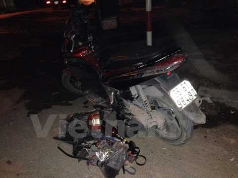 | Chiếc xe máy bị đâm vào tường khiến 2 thanh niên nguy kịch (Ảnh: Sơn Bách/Vietnam+) |