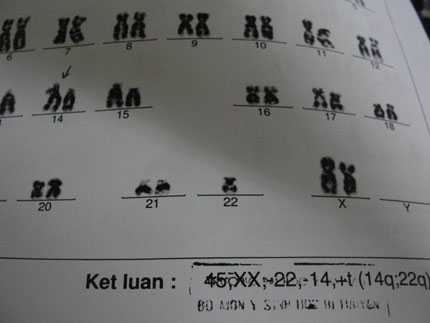 Bác sĩ chỉ định chị chọc ối để phân tích nhiễm sắc thể của thai. Kết quả là con chị không bị Down nhưng lại bị một trục trặc về bộ nhiễm sắc thể: Chuyển đoạn cân bằng ở nhiễm sắc thể 14 – 22.
