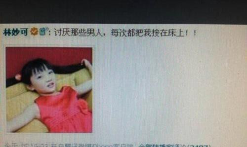 Tháng 8/2012, trên weibo cá nhân, cô bé Lâm Diệu Khả cho đăng hình ảnh của bé cùng dòng status: “Ghét những anh chàng này, lần nào cũng đều đè nghiến tôi trên giường”. Ngay lập tức, dòng thông điệp này của Lâm Diệu Khả đã thu hút sự chú ý của rất nhiều cư dân mạng, sau đó đã được họ chia sẻ và phát tán rộng rãi trên mạng.