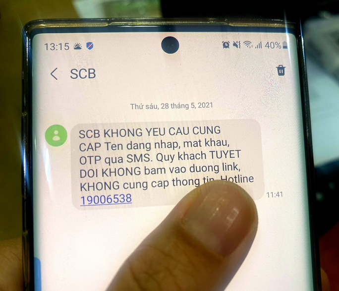 SCB gửi tin nhắn SMS cảnh báo tới khách hàng.