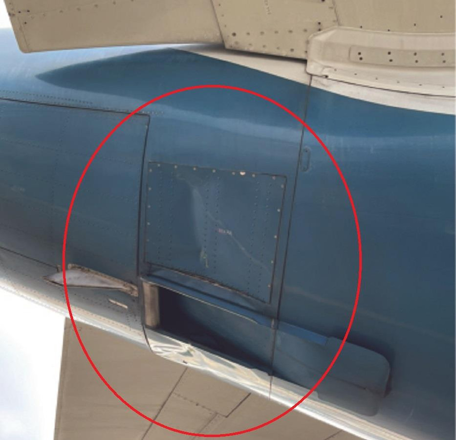 Vị trí khung sườn, thanh chống bên trái máy bay có vết lõm dài 67cm, rộng 50cm, sâu 1cm; vị trí cửa tiếp cận, thanh chống bên phải có vết lõm dài 64cm, rộng 54cm, sâu 1,1cm; vỏ miệng hút khí động cơ phụ bị một số vết rạn tại phần góc.