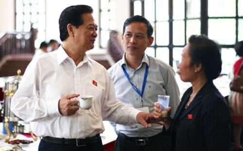 | Thủ tướng trao đổi với các đại biểu bên hành lang Quốc hội. |