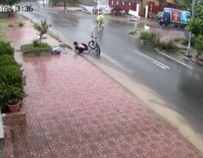 Trước đó, hình ảnh cậu bé mặc đồng phục học sinh đi xe đạp, dừng lại trước miệng cống thoát nước để dọn rác dưới trời mưa, được camera của người dân ghi lại.