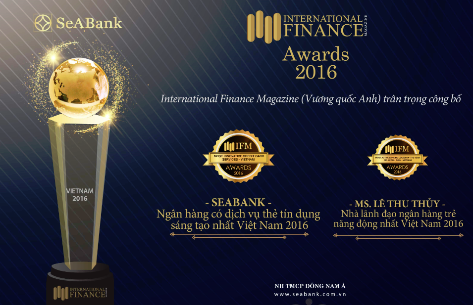 Với những tính năng và tiện ích đa dạng, tiêu chuẩn bảo mật cao cùng nhiều ưu đãi hấp dẫn, dịch vụ Thẻ tín dụng của SeABank đã được IFM bình chọn là “Ngân hàng có dịch vụ Thẻ tín dụng sáng tạo nhất 2016” (Most Innovative Credit Card Services Vietnam) – giải thưởng ghi nhận những cố gắng và sáng tạo của SeABank nhằm đem tới nhiều lợi ích cho khách hàng.