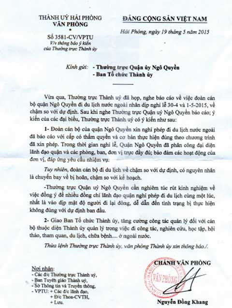 | Thành ủy Hải Phòng thông báo chính thức về việc đoàn cán bộ quận Ngô Quyền đi du lịch nước ngoài dịp nghỉ lễ, hết lễ chưa về |