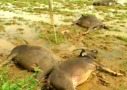 Đàn trâu gồm 9 con đang gặm cỏ trên cánh đồng thuộc thôn Triều Dương thì gặp mưa lớn kèm theo sấm sét nên bị sét đánh chết tại chỗ.