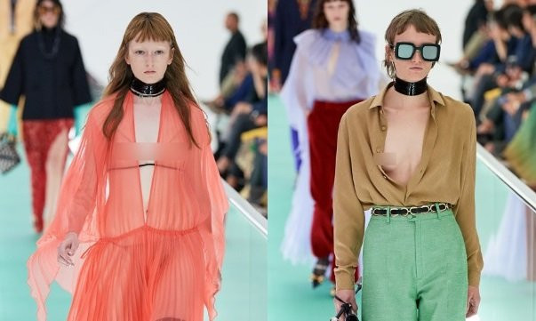 Những mẫu váy xếp li, quần cạp cao đến sơ mi lụa được làm mới bằng bảng màu sắc lạ mắt, phom dáng tôn đường cong người mặc. Đa số các mẫu nữ trình diễn trong bộ sưu tập (BST) lần này đều không diện nội y, để lộ toàn bộ vòng một trước ống kính.