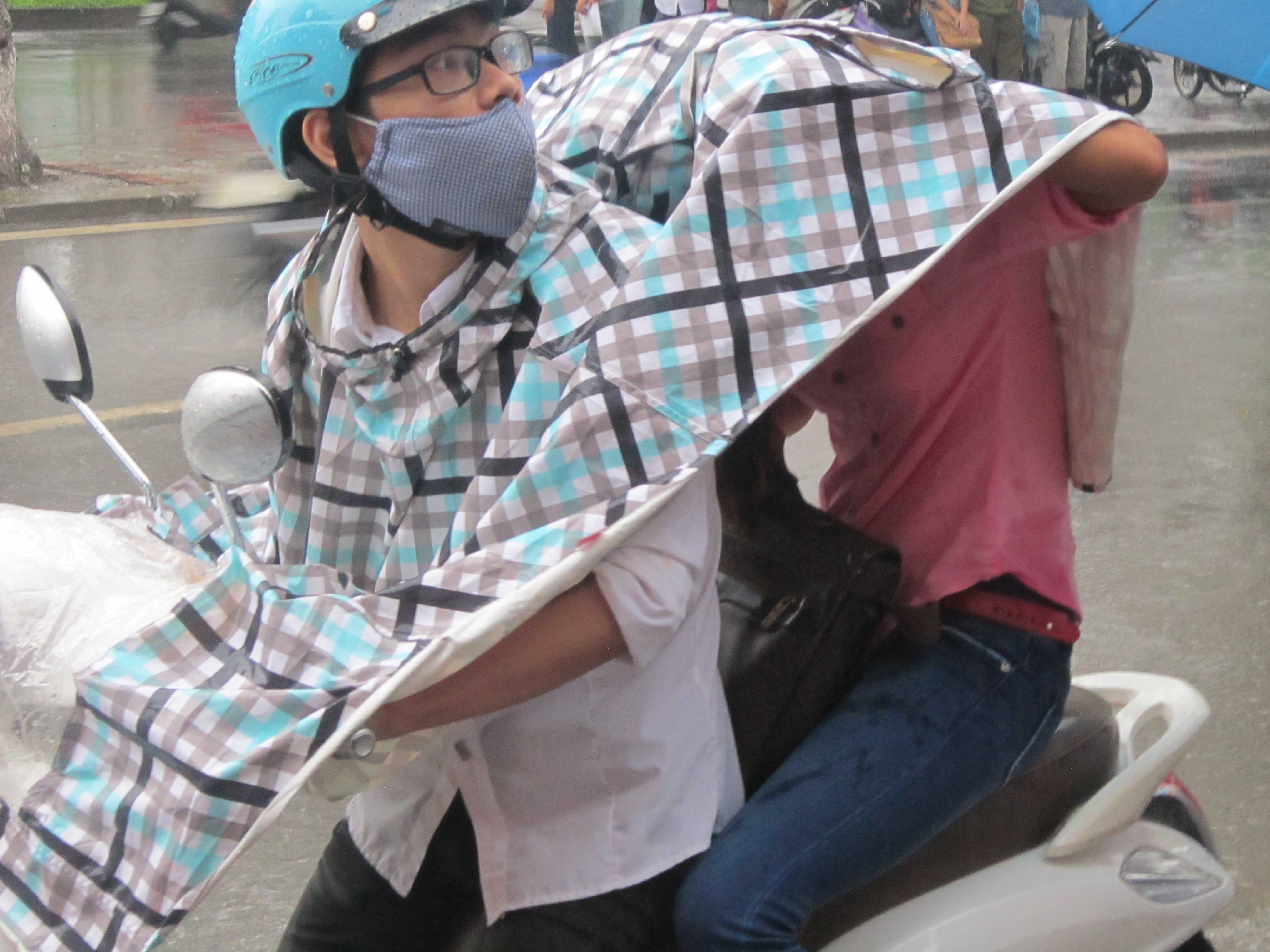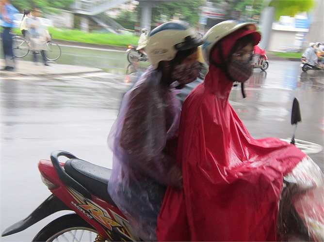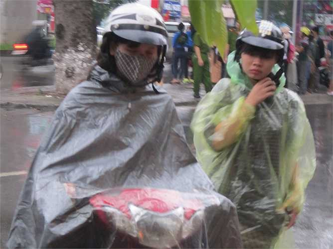 Dường như áo mưa cũng không đủ ngăn lại những hạt mưa dày hạt. Mặc tới 2 lớp áo mưa mà 2 bố con sĩ tử này vẫn ướt sũng.