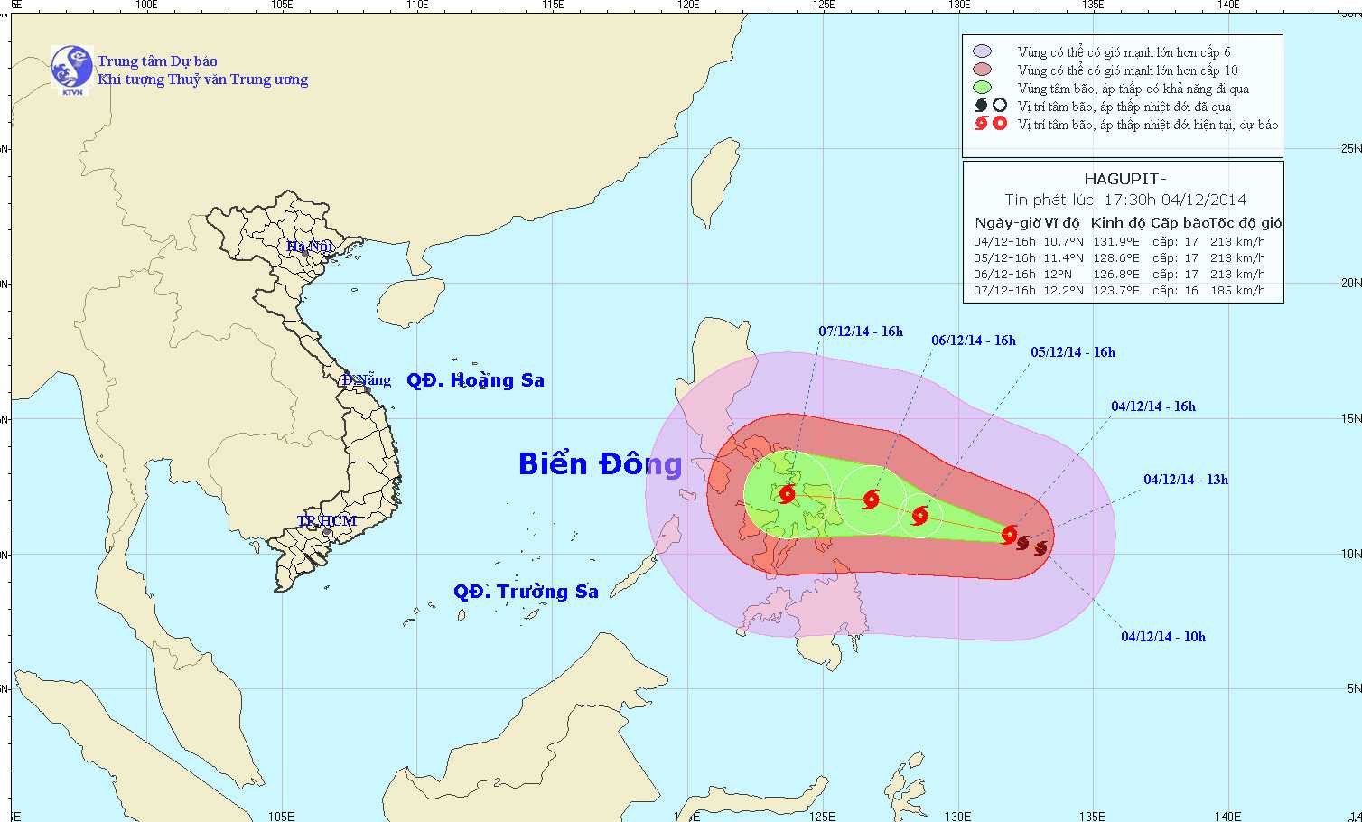 Dự báo trong 24 giờ tới, siêu bão di chuyển theo hướng Tây Tây Bắc, mỗi giờ đi được khoảng 25 - 30km. Đến 16 giờ ngày 05/12, vị trí tâm siêu bão ở vào khoảng 11,4 độ Vĩ Bắc; 128,6 độ Kinh Đông, cách đảo Xama (Philippines) khoảng 390 km về phía Đông Nam. Sức gió mạnh nhất ở vùng gần tâm siêu bão mạnh cấp 17 (tức là từ 202 đến 221 km một giờ), giật trên cấp 17.