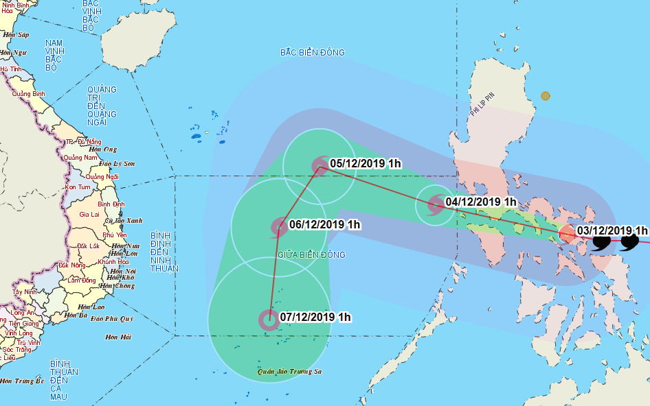 Dự báo trong 24 giờ tới, bão di chuyển theo hướng Tây Tây Bắc, mỗi giờ đi được 15-20km. Đến 16h ngày 4/12, vị trí tâm bão ở cách đảo Song Tử Tây khoảng 480km về phía Đông Bắc. Sức gió mạnh nhất vùng gần tâm bão mạnh cấp 11-12 (100-135km/giờ), giật cấp 15.