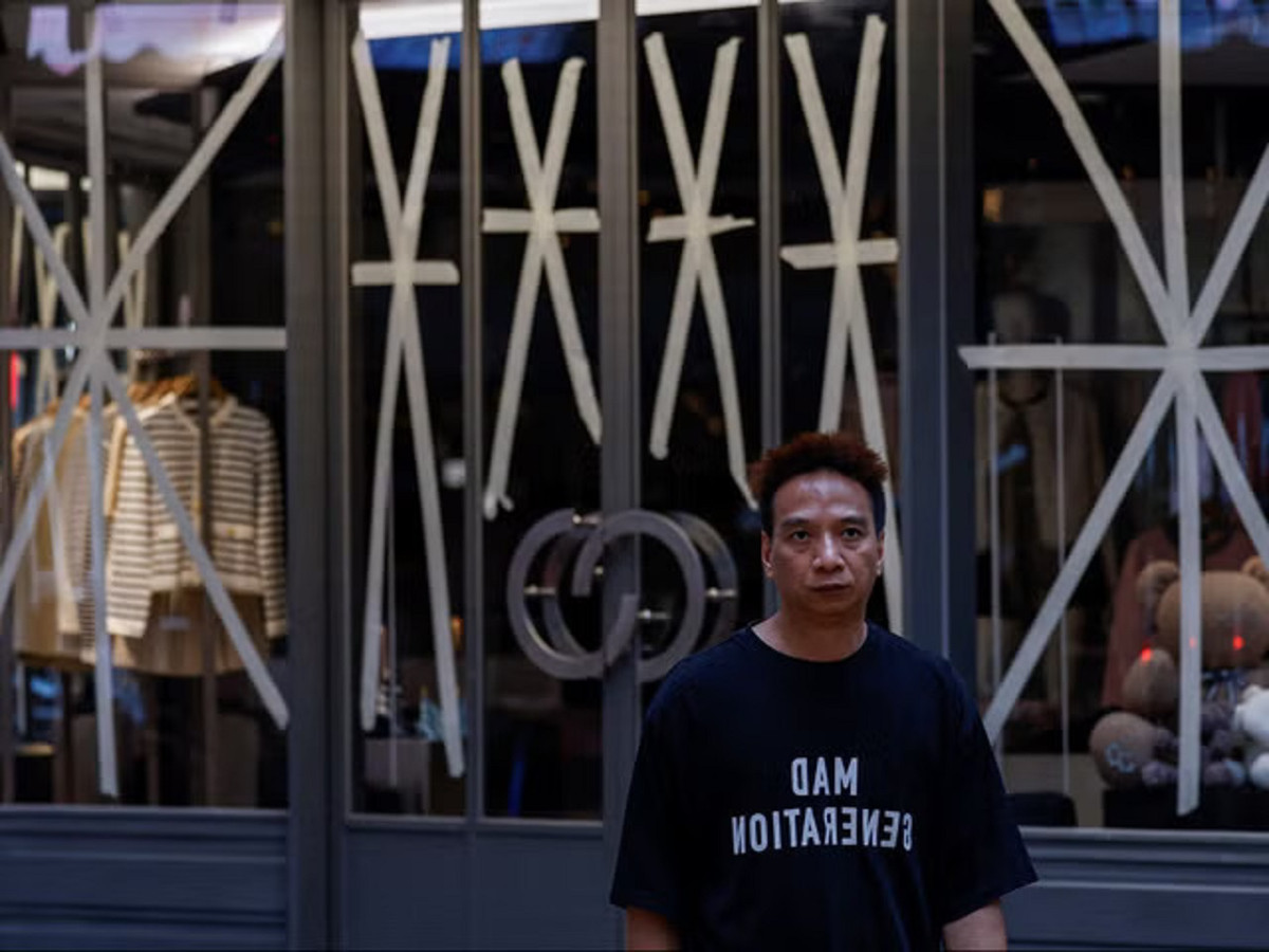 Cửa hàng dán băng dính chắn bão ở Hong Kong, Trung Quốc.