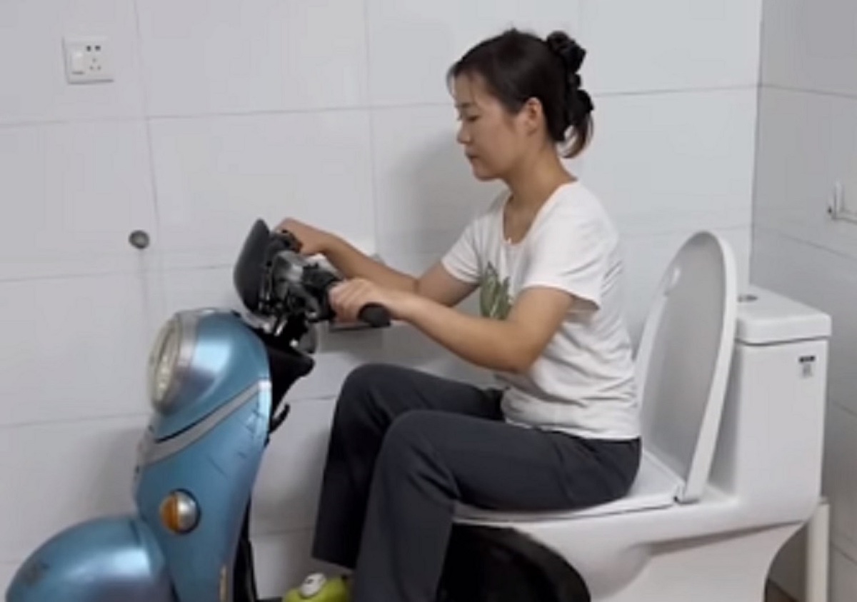 Đây là chiếc bồn cầu được "lai ghép" với xe máy, khi cần xả nước thì người dùng chỉ cần vặn tay ga.