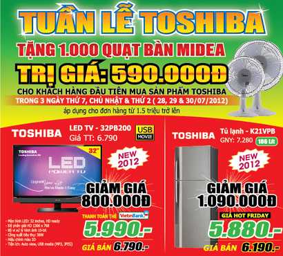 Đặc biệt tại Media Mart đang diễn ra tuần lễ Toshiba với chương trình tặng 1000 quạt bàn Midea trị giá 590.000 đồng cho 1000 khách hàng đầu tiên mua sản phẩm Toshiba trong 3 ngày 28,29,30/7. Đồng thời các sản phẩm TV, tủ lạnh, máy giặt Toshiba cũng được giảm giá từ 800.000 đến 3 triệu đồng.