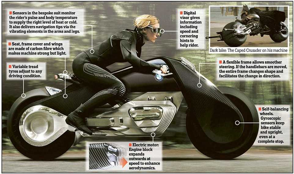 Nhờ vậy, người lái không cần đội mũ bảo hiểm hay mặc đồ bảo vệ, thay vào đó là một bộ quần áo “điều hòa” có chức năng sưởi ấm, làm mát hoặc thổi phồng phần cổ làm tăng cảm giác thoải mái. Đặc biệt, chiếc xe và người lái luôn luôn được kết nối thông qua một cặp kính hiển thị các thông số như đường chạy lý tưởng hay góc nghiêng phù hợp.