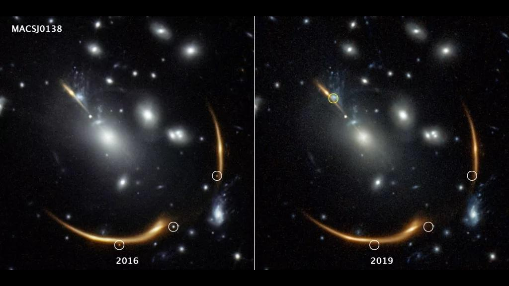 Trong một hình ảnh tiếp theo của cụm được chụp vào năm 2019, cả ba điểm sáng đã biến mất hoàn toàn, xác nhận rằng chúng đều là hình ảnh phản chiếu của cùng một nguồn sáng ở xa.