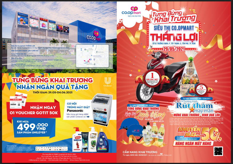 Bên cạnh tập trung giảm giá mạnh cho nhiều mặt hàng, trong ba ngày đầu mở cửa bán hàng từ ngày 29/5 đến 31/5/2021, siêu thị Co.opmart và TTTM Thắng Lợi còn tặng hàng trăm phần quà hấp dẫn cho những khách hàng đầu tiên đến mua sắm tại siêu thị và có hóa đơn mua hàng chỉ từ 400.000 đồng.