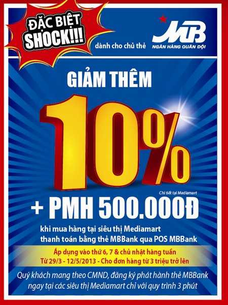 Chưa dừng ở đó, theo thỏa thuận hợp tác chiến lược dài hạn giữa Media Mart và Ngân hàng Quân đội MBBank, chủ thẻ MBBank sẽ được giảm thêm 10% và tặng thêm PMH 500.000đ khi mua sắm đơn hàng điện máy, máy tính, mobile từ 3 triệu đồng trở lên tại Media Mart.