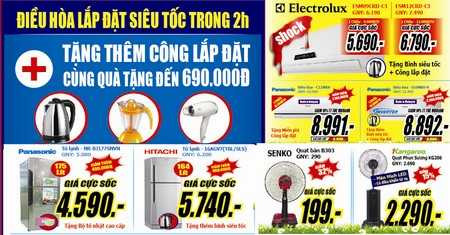 Một số sản phẩm giảm giá sâu như tủ lạnh Panasonic 175l NR-BJ117SNVN giảm 490.000đ còn 4.590.000đ tăng bộ tô Nhật, điều hòa Panasonic 1 chiều 12000BTU thanh toán qua thẻ MBBank giảm 10% còn 8.991.000đ, điều hòa 1 chiều 9000 BTU Electrolux ESM09CRD-C1 giá cực sốc 5.690.000đ… Miễn phí công lắp đặt, tặng thêm bình siêu tốc, máy vắt cam hay máy sấy tóc trị giá đến 690.000đ cho điều hòa.