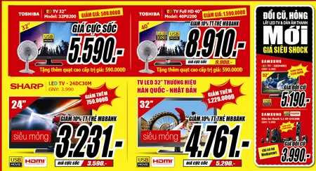 Được giảm thêm 10% khi thanh toán qua thẻ MB, lại được tặng thêm quạt cây cao cấp trị giá 590.000đ, TV LED Full HD 40’’ Toshiba 40PU200 giá chỉ còn 8.910.000đ; LED 24’’ Sharp 24DC30M giá MBBank 3.231.000đ…
