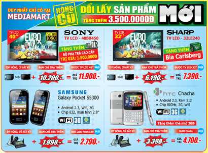 Tham gia chương trình “Hỏng cũ đổi lấy mới”, khách hàng còn dễ dàng sở hữu TV LCD 40’’Sony 40BX450 với chi phí trả thêm 10.200.000 đồng thay vì mua mới với giá 11.900.000 đồng lại được tặng thêm bộ pha trà cao cấp, hay đổi lấy TV LED 32’’ Sharp 32LE240 chỉ phải trả thêm 6.190.000 đồng hoặc trả thêm 1.998.000 đồng để nhận ĐTDĐ Samsung Galaxy Pocket S5300..