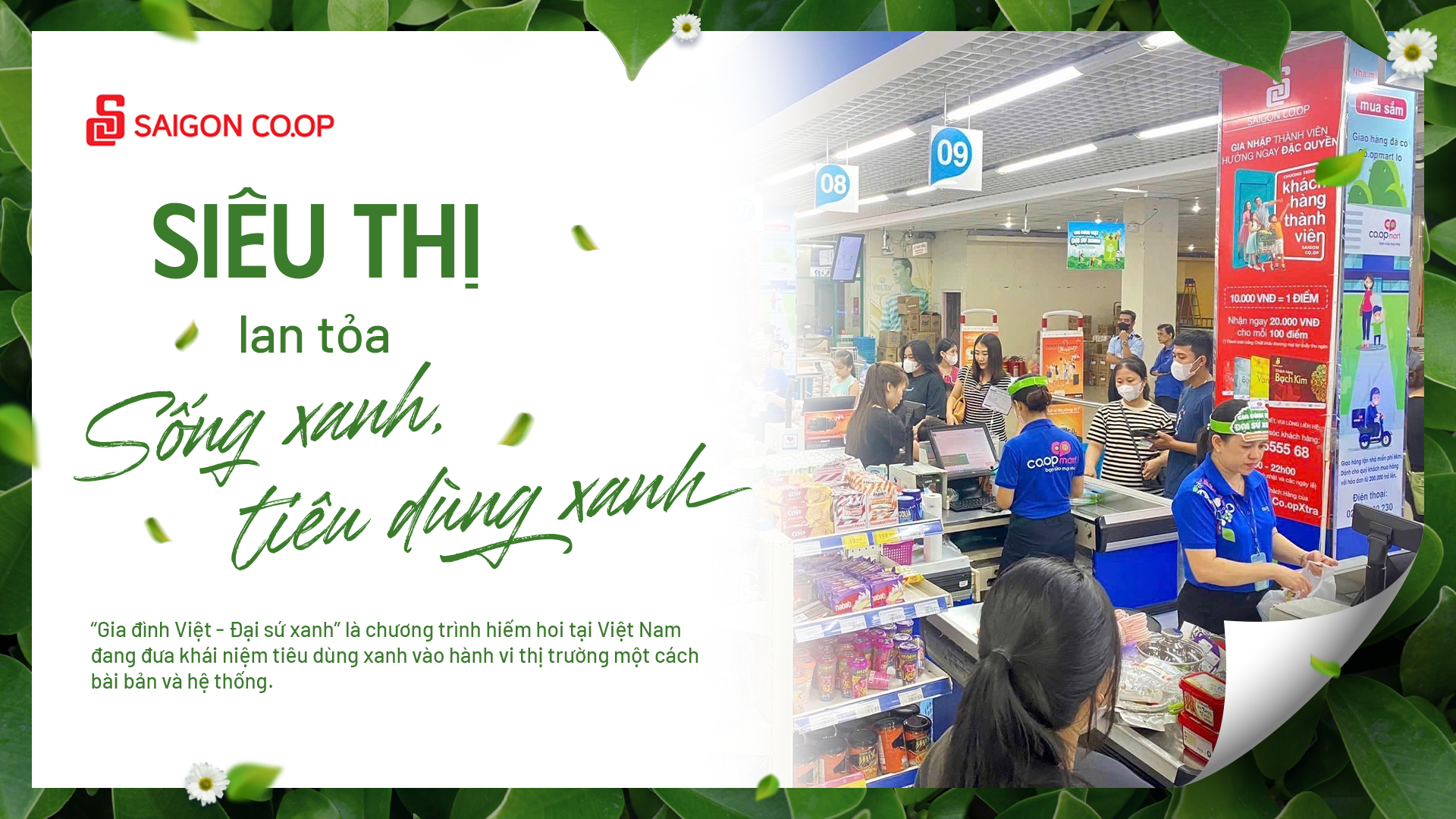 Trong tháng 6 vừa qua, các điểm bán thuộc Liên hiệp Hợp tác xã Thương mại TP.HCM (Saigon Co.op) bao gồm Co.opmart, Co.opXtra, Co.op Food, Co.op Smile, Cheers, Finelife, Sense City, SenseMarket triển khai chương trình dành riêng cho môi trường. Lấy ngày “đinh” trong tháng 6 là ngày Gia đình Việt Nam (28/6), đơn vị này kết hợp với yếu tố kinh doanh để tạo nên chương trình khuyến mãi “Gia đình Việt – Đại sứ xanh”.