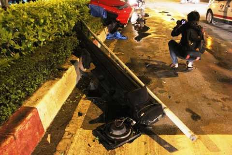 Khi tới khu vực này do chiếc xe chạy nhanh không làm chủ tốc độ nên mất lái phi thẳng lên dải phân cách, húc gãy cột đèn tín hiệu.