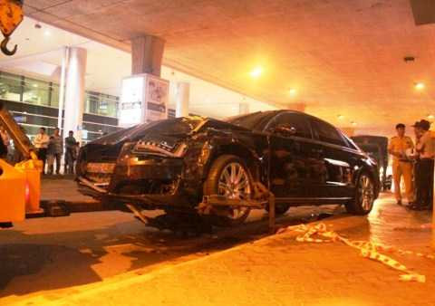 | Chiếc xe hiệu Audi hư hỏng phần đầu sau vụ tai nạn |
