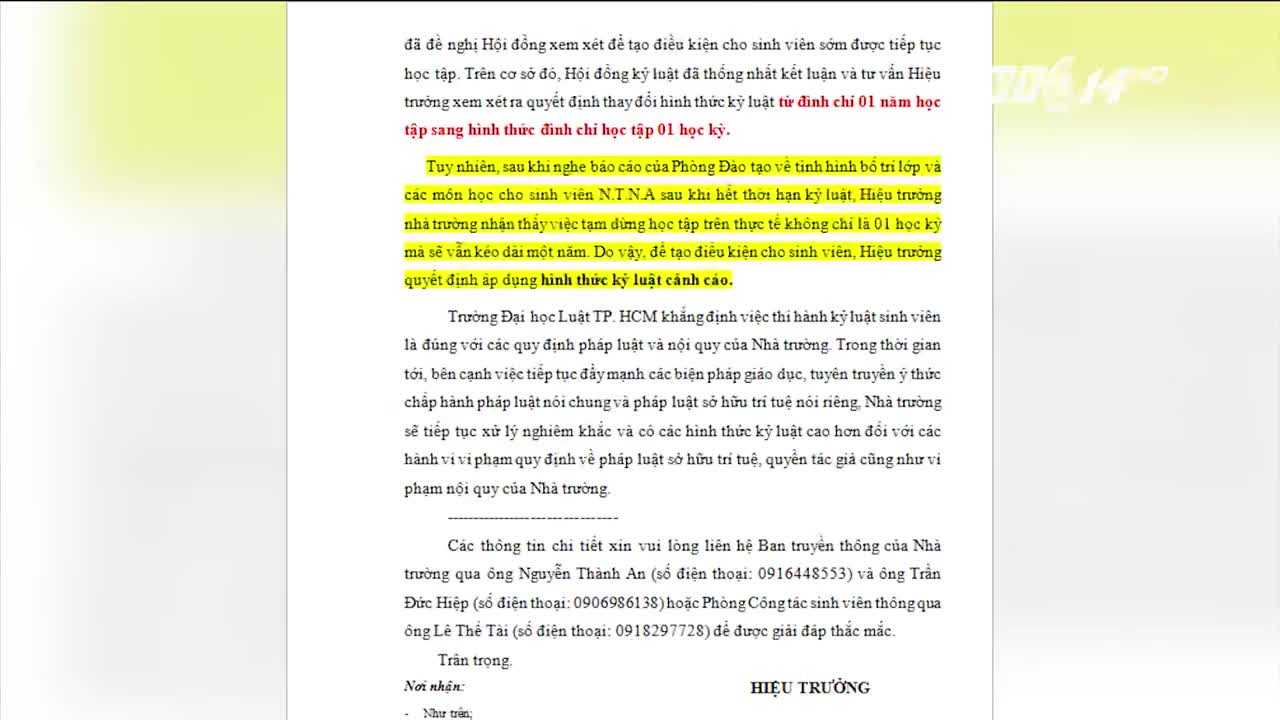 16/02/2017 07:21:00 +07:00Chiều 15/2, Hiệu trưởng trường ĐH Luật TP.HCM đã ra quyết định giảm mức kỷ luật từ đình chỉ học 1 năm xuống còn cảnh cáo với sinh viên mang giáo trình photo vào trường.