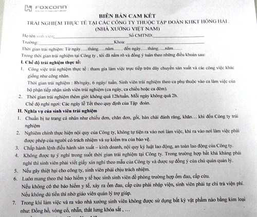 Điều đáng nói là gần 50 sinh viên của lớp “Điện tử viễn thông” và lớp “Điện tử Phát thanh truyền hình” của Trường Cao đẳng Phát thanh Truyền hình 1 (thuộc Đài tiếng nói Việt nam) cũng được đưa tới một nhà máy của Foxconn thuộc hệ thống của Công ty Hồng Hải (Đài Loan).