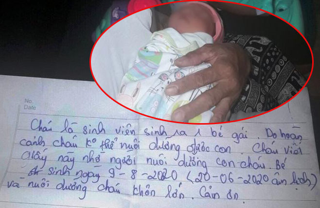 Bức thư có nội dung: “Cháu là sinh viên sinh ra một bé gái. Do hoàn cảnh cháu không thể nuôi dưỡng được con, cháu viết giấy này nhờ người nuôi dưỡng con cháu. Bé sinh ngày 9/8/2020 (20/6 Âm lịch) và nuôi dưỡng cháu khôn lớn. Cảm ơn”.