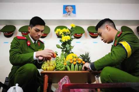 | Để chuẩn không khí ngày Tết, các học viên Cảnh sát còn tự tay đi chợ sắm mâm ngũ quả về bày biện trong phòng. Các em đang háo hức chờ đợi tiệc tất niên, phút giao thừa đặc biệt bên đồng đội, thầy cô. "Giờ phút ấy em sẽ gọi điện về chúc Tết gia đình. Có lẽ sẽ thoáng buồn, thoáng nhớ nhà nhưng dù vậy, được ăn Tết ở trường chắc chắn sẽ là kỷ niệm rất thú vị, ý nghĩa trong cuộc đời sinh viên của em", Nguyễn Diệu Linh (lớp B11) tâm sự. |