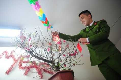 | Để không khí ngày Tết ngập tràn, nhiều phòng ký túc có sinh viên ở lại trực đã được trang trí hoa đào, đèn lồng rực rỡ. Nguyễn Ngọc Anh (phòng 502 nhà K6) cho biết, để có được cây đào rất đẹp này, các bạn trong phòng em đã đến tận vườn ở Nhật Tân chọn lựa. "Dịp Tết mọi năm em vẫn cùng bố mẹ đi chợ mua quất, đào về trang trí. Năm nay ăn Tết xa nhà, cảm giác lúc đầu có chút buồn nhưng khi cùng đồng đội trang hoàng phòng ốc, cũng trang trí hoa đào, lọ ly, lắp đèn nháy... nỗi nhớ nhà đã vơi đi và thay bằng một niềm vui, sự hân hoan khó tả", nam sinh 20 tuổi quê Hải Dương nói. |