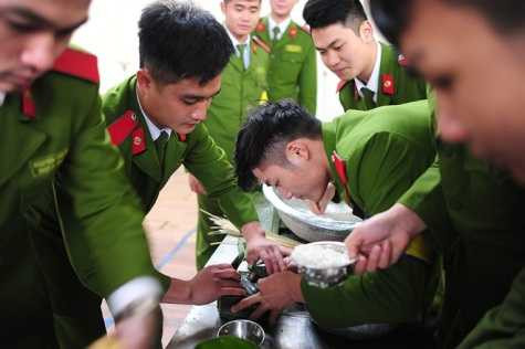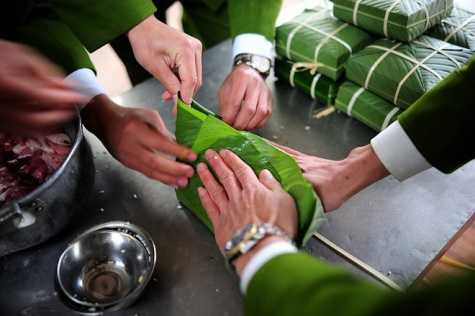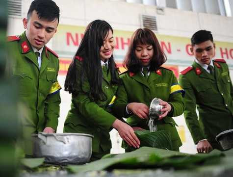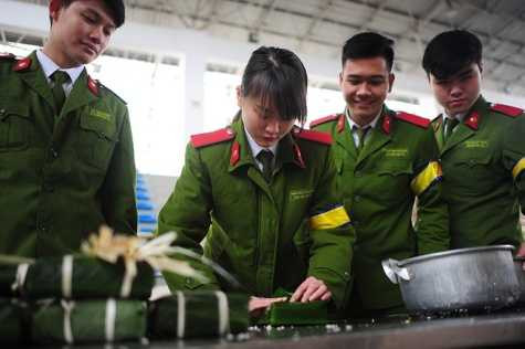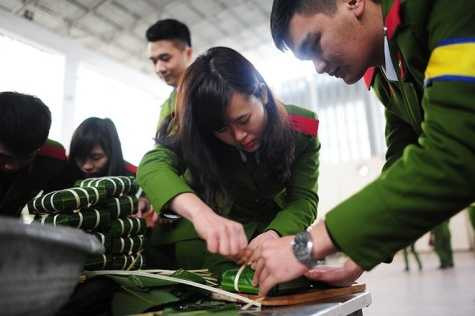 | Ngày 4/2, các sinh viên năm 2, khóa D40 Học viện Cảnh sát nhân dân (Hà Nội) ở lại trực trường dịp Tết Nguyên đán đã cùng nhau gói bánh chưng. Giáo viên chủ nhiệm khóa D40 Đặng Đình Cường cho biết, đây là một trong những hoạt động nhà trường tổ chức để 250 sinh viên trực đợt 1 (từ ngày 21 tháng chạp đến mùng 2 tháng giêng) được đón cái Tết cổ truyền của dân tộc. Từ đầu đợt trực đến nay, học viên đã tham gia thi đấu bóng chuyền, bóng đá, các trò chơi dân gian và thăm hỏi tặng quà các hoàn cảnh khó khăn trong bệnh viện... "Trọng tâm của hoạt động đón Tết là đêm lửa trại đón giao thừa với tiệc heo quay, thịt gà, bày mâm ngũ quả... Ban giám đốc Học viện, lãnh đạo phòng quản lý sẽ đến chúc Tết và lì xì học viên", thầy Cường nói. |