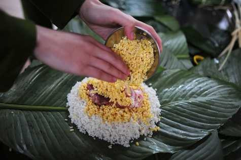 | Vừa giữ lá, tạo khuôn, vừa cho gạo đỗ, gia vị... nên một chiếc bánh cần nhiều bàn tay cùng góp sức. |