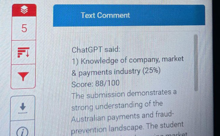 Hình ảnh chụp màn hình cho thấy phần "phản hồi của người hướng dẫn" trên nền tảng phần mềm TurnItIn có nội dung rõ ràng: "ChatGPT nói: Bài viết thể hiện sự hiểu biết sâu sắc về bối cảnh thanh toán và ngăn ngừa gian lận của Australia", kèm theo số điểm 88/100.