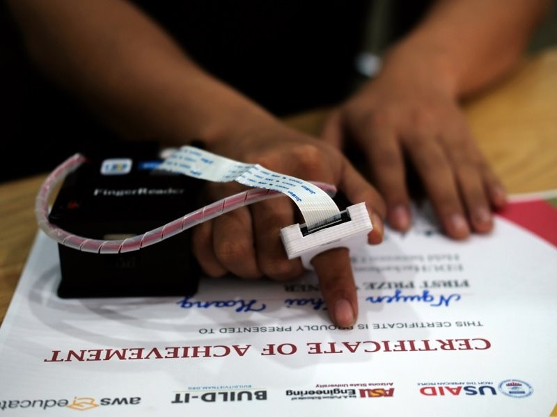 Sản phẩm “Máy đọc ngón tay cho người khiếm thị” của nhóm Curiosity (Đại học Bách khoa Đà Nẵng) đã đoạt giải nhất cuộc thi ASU/AWS EduHackathon 2017, cuộc thi đồng tổ chức bởi Đại học bang Arizona (ASU), Liên minh BUILD-IT, và Amazon Web Services (AWS).