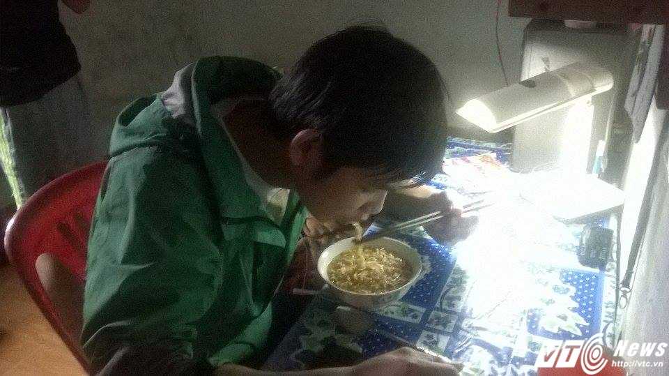 Một bạn sinh viên ở Huế đang ăn mỳ tôm để lấy sức ôn thi.