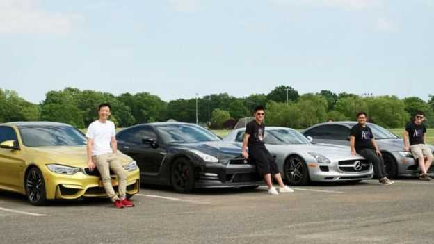 Dylan Gao, Shawn Mao, Nicholas Lam và Victor Yang bên cạnh những chiếc xe của mình: BMW M4 đời 2015, Nissan GTR đời 2015, Mercedes SLS đời 2012, và chiếc BMW M3 đời 2011. Ảnh TOM STARKWEATHER