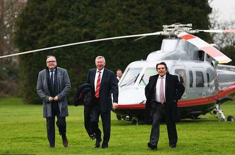 | Sir Alex cùng bạn thân đi máy bay trực thăng tới sân xem Man Utd thi đấu. |