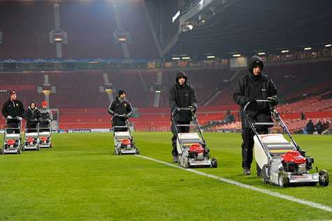 | Các nhân viên tại sân Old Trafford đang nỗ lực chăm sóc lại mặt cỏ |