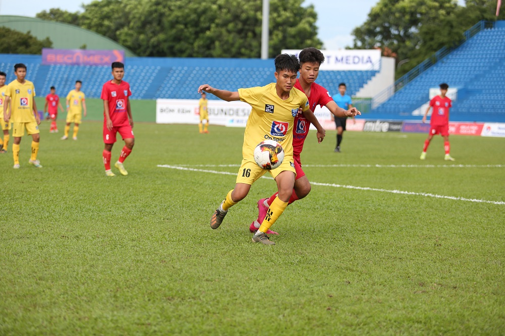 U15 SLNA nhận thất bại sát nút U15 B. Bình Dương (áo đỏ).