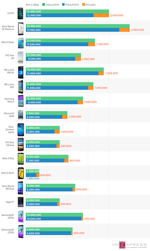| Biểu đồ so sánh mức giảm giá của smartphone trong tháng 4. Bấm vào để xem hình lớn. Đồ hoạ: Việt Chung. |
